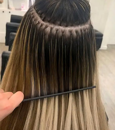 Beschreibung: Strähnen werden mit Keratin- Bondings dauerhaft am Eigenhaar befestigt. Die Verbindung wird mit Wärme geschmolzen und fixiert.